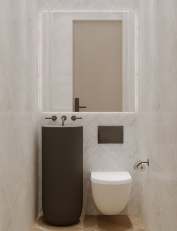 Bedrooms emphasize tranquility through the use of soft textiles, wooden floors, and neutral tones, balanced by contemporary pendant lights and minimalist artwork. The bathrooms are a luxurious retreat, featuring marble finishes, floating vanities, and recessed lighting that enhance the feeling of spaciousness and calm. Every element of this project is thoughtfully curated, achieving a perfect balance between aesthetic beauty and everyday practicality.